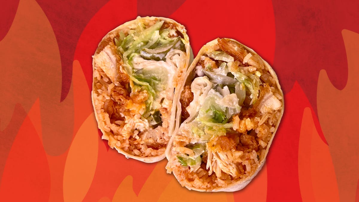 Tito’s hot crispy chicken, rice, lettuce, Tito’s cheeses, ranch, dill pickle slices and wrapped in a fresh tortilla!